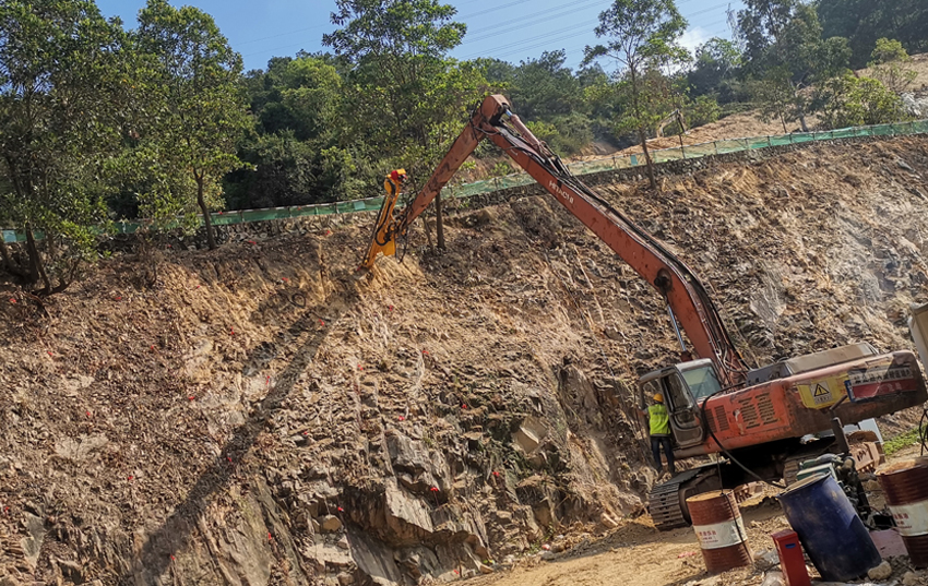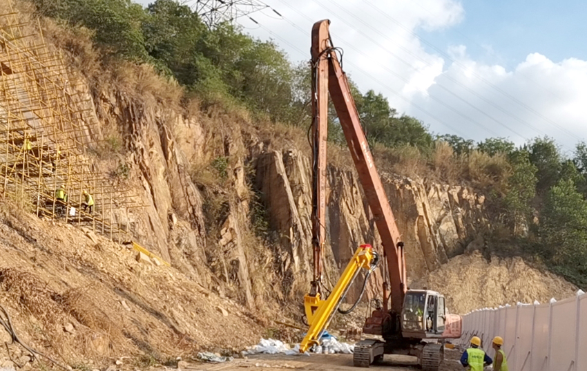3、作業(yè)半徑擴(kuò)大化 。因為挖掘機小臂不拆,它的作業(yè)半徑可以延長作業(yè)半徑2-3米,且仰角打孔、水平打孔、豎直打孔都可以實現(xiàn)。
